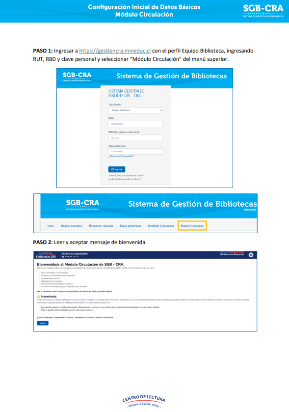 El ingreso al SGB-CRA está diferenciado por dos perfiles: perfil “Equipo Directivo” y perfil “Equipo de Biblioteca”. A continuación, encontrará las instrucciones para acceder a cada uno de ellos: