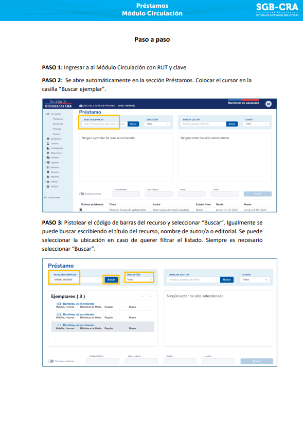 Para facilitar el acceso al SGB-CRA, ponemos a disposición de los equipos directivos y los equipos de biblioteca un manual que recorre los módulos, explicando los procesos que se realizan en cada uno ellos.