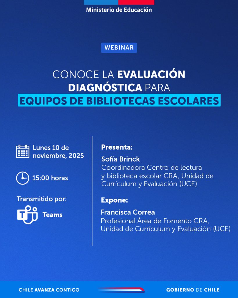 El programa de Bibliotecas Escolares CRA, perteneciente a la Unidad de Currículum y Evaluación del Ministerio de Educación, tiene el agrado de invitarle a la conferencia online “Conoce la Evaluación Diagnóstica para equipos de bibliotecas escolares”.