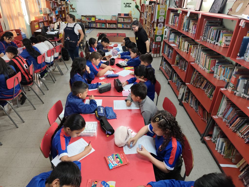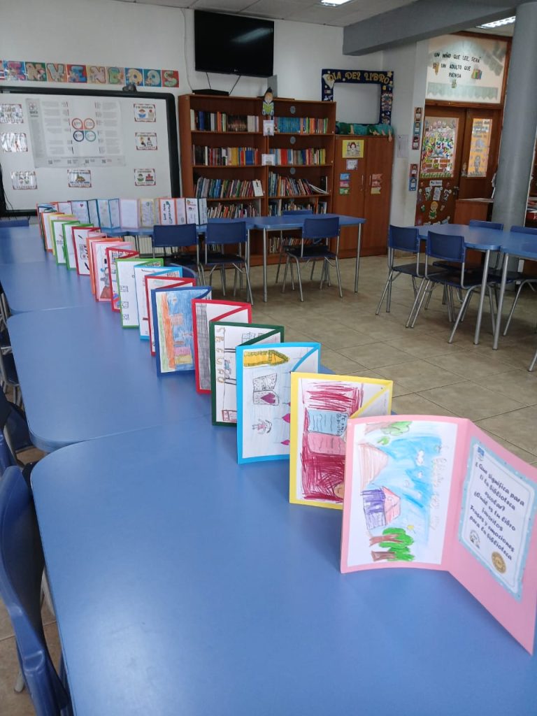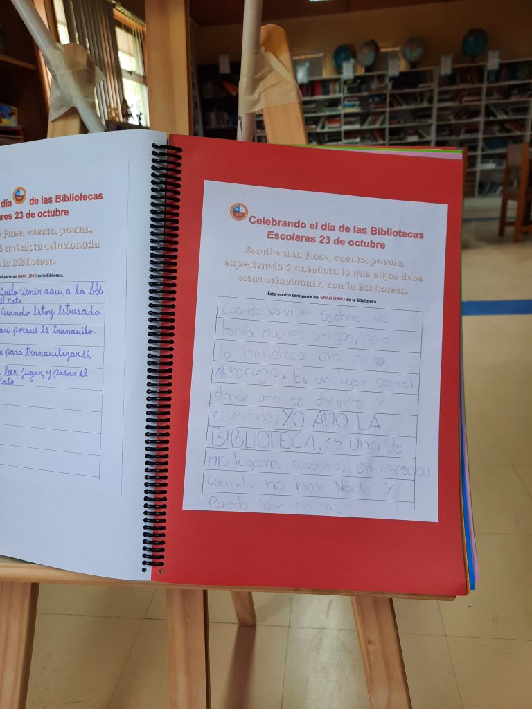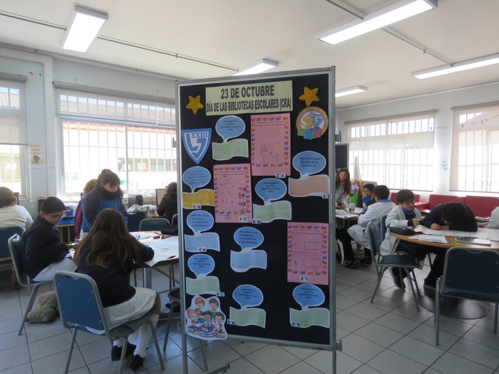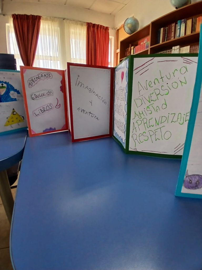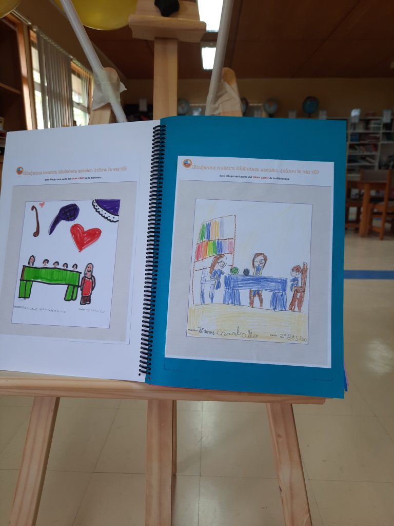 Esta actividad se desarrolló en clases de lenguaje y arte junto a la encargada CRA. A las y los estudiantes se les solicitó dibujar o escribir qué significa la biblioteca escolar para ellos, algún libro favorito, qué sienten en la biblioteca o frases para incentivar la visita a la biblioteca del establecimiento. “Además, se invitó a alumnos de Pre básica a pintar un mini libro y ver la creación del Gran libro de nuestra biblioteca. El objetivo fue recopilar la percepción de la biblioteca CRA sus libros preferidos”, explican.