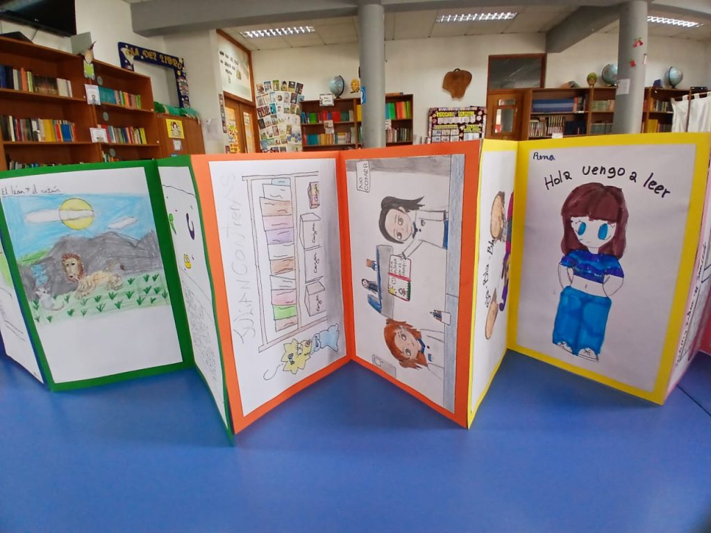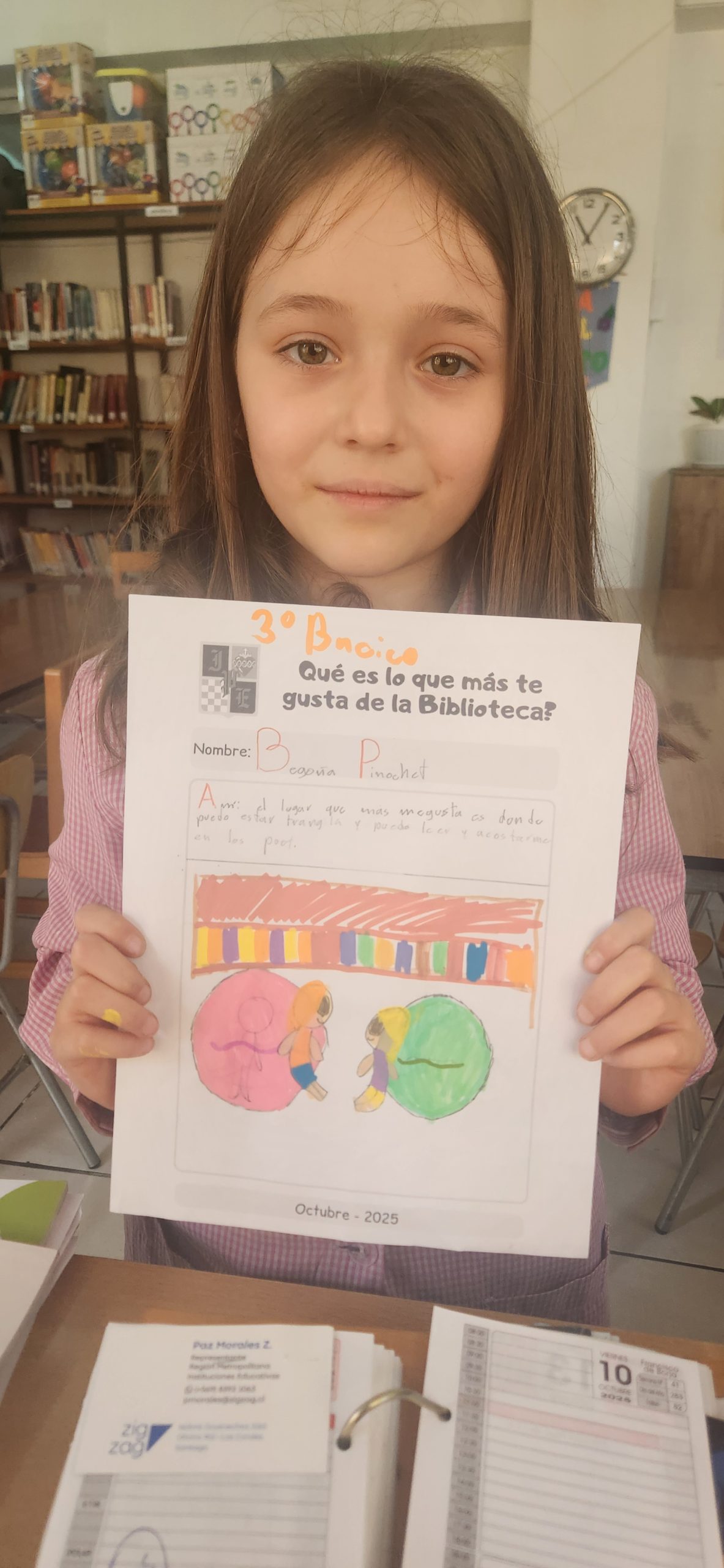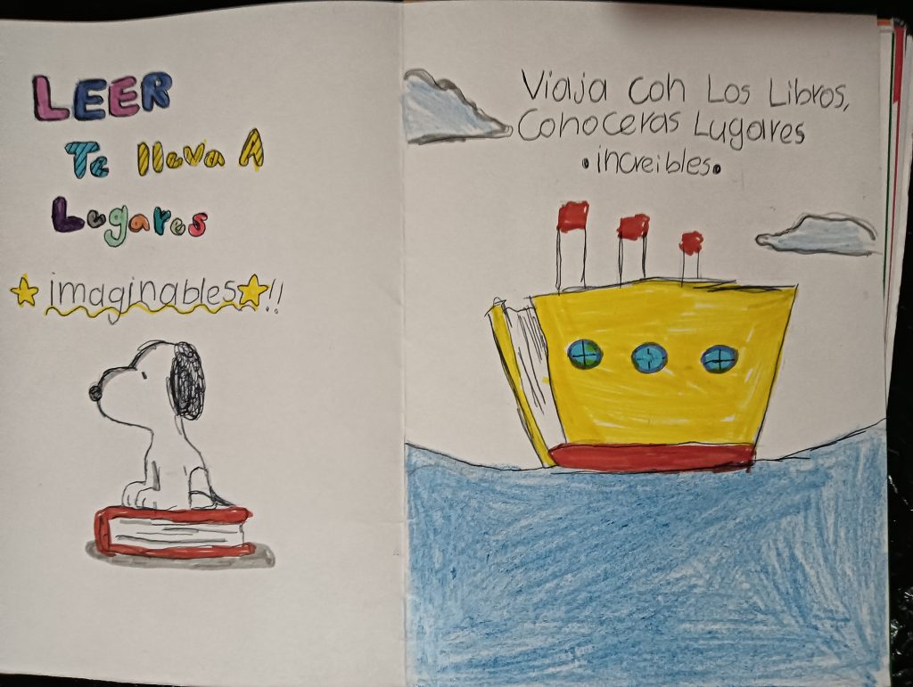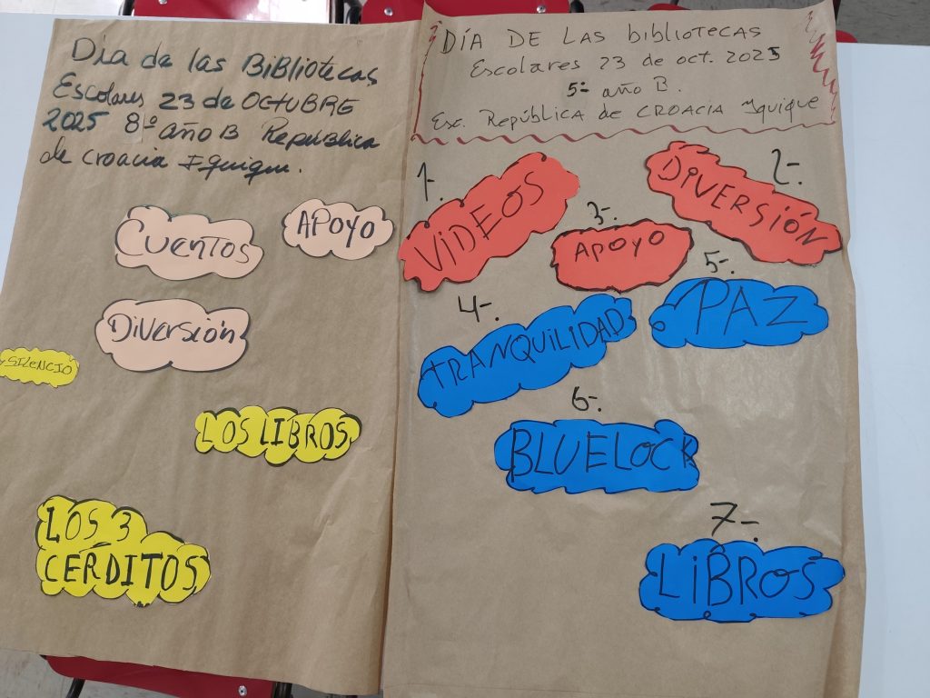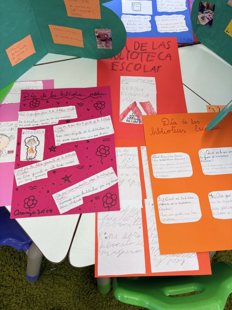 Esta actividad se desarrolló en clases de lenguaje y arte junto a la encargada CRA. A las y los estudiantes se les solicitó dibujar o escribir qué significa la biblioteca escolar para ellos, algún libro favorito, qué sienten en la biblioteca o frases para incentivar la visita a la biblioteca del establecimiento. “Además, se invitó a alumnos de Pre básica a pintar un mini libro y ver la creación del Gran libro de nuestra biblioteca. El objetivo fue recopilar la percepción de la biblioteca CRA sus libros preferidos”, explican.
