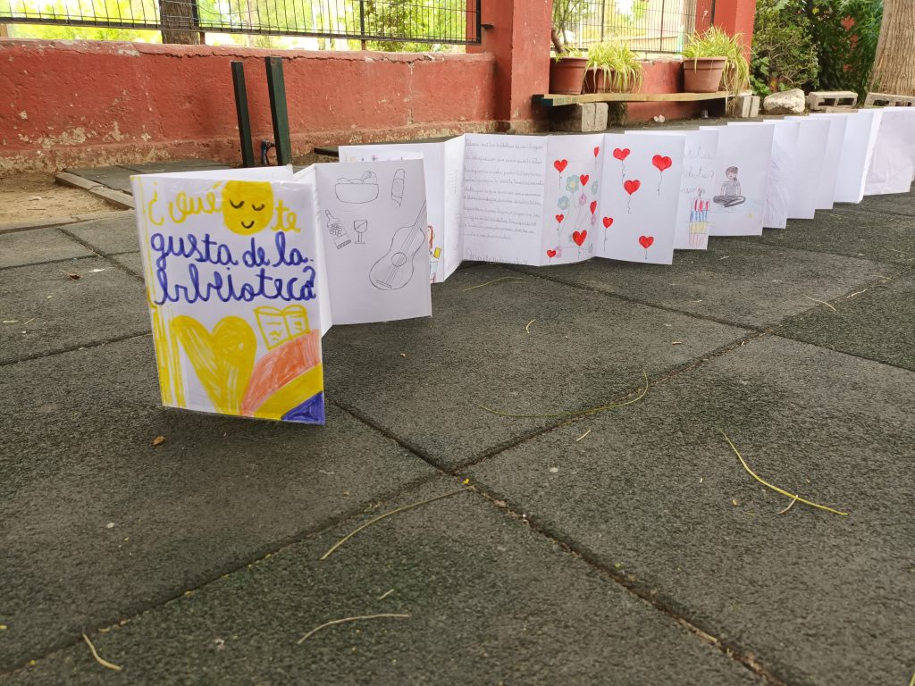Más de 240 estudiantes dibujaron en cartulinas de colores y escribieron frases cortas e historietas para crear un libro gigante. “Los estudiantes logran reconocer y expresar como perciben la Biblioteca”, dice Graciela Vera.