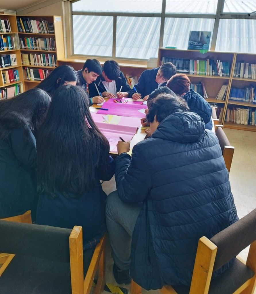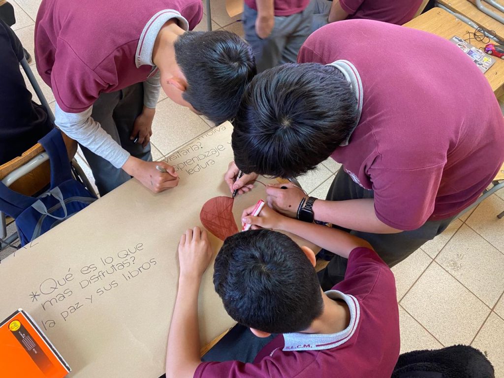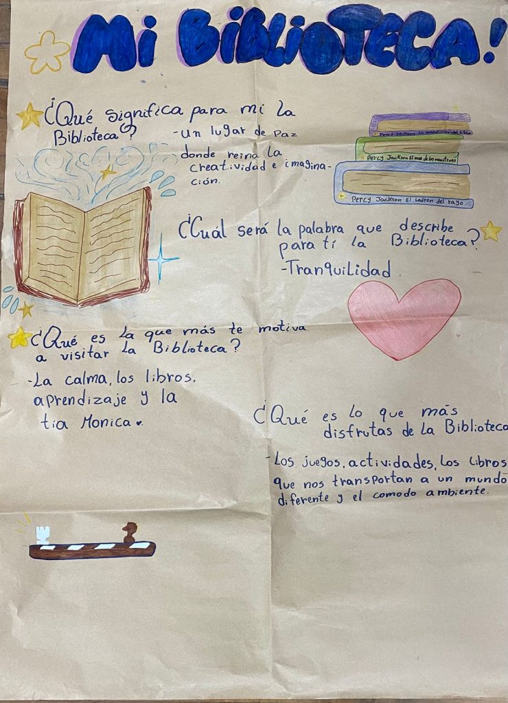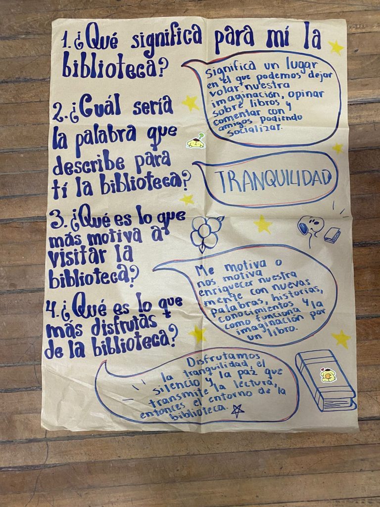Con el objetivo de recopilar la percepción de los estudiantes sobre la biblioteca escolar del colegio, las y los alumnos del Colegio San Damián de Molokai reflexionaron a partir de preguntas orientadoras referidas a la biblioteca y dejaron registro de ellas en un papelógrafo.