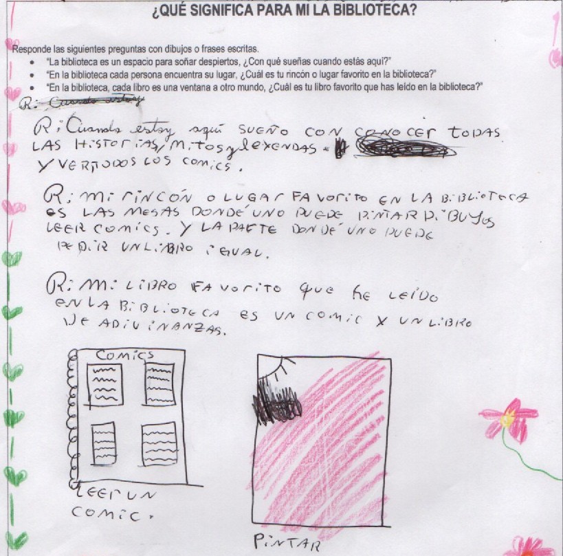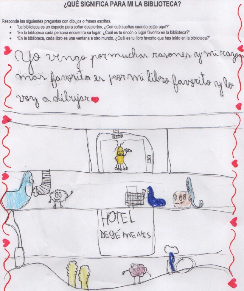 Con el fin de conocer y recopilar las diversas percepciones de las y los estudiantes sobre la biblioteca escolar del establecimiento se aplicaron las preguntas “¿Te gusta visitar la biblioteca? ¿Por qué? ¿Cómo te sientes en biblioteca? ¿Cuál es tu lugar favorito en biblioteca?”. Asimismo, se expresaron en dibujo en base a la pregunta “¿Cómo ves la biblioteca de tu establecimiento?” y, finalmente, en poemas, frases y microcuentos una anécdota que tuviera relación con la biblioteca escolar.