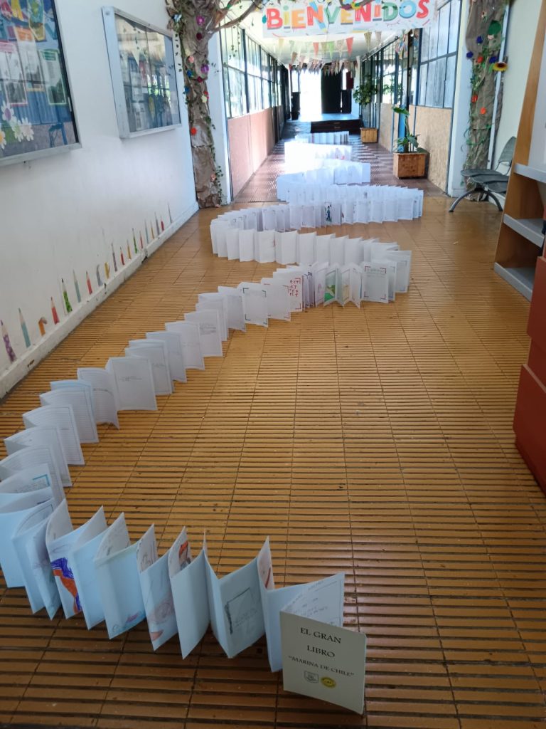La actividad “El gran Libro del Colegio Marina de Chile” estuvo dirigida a todo el colegio (primer ciclo, educación básica, media y docentes). Con alrededor de 500 participantes, se buscó fomentar el gusto por la lectura mediante la creación de una portada y un texto que expresaran las ideas y emociones que surgieron al leer los libros favoritos de los estudiantes.